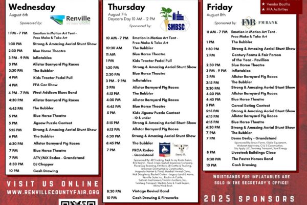 The Renville County Fair is hosting Daycare Day on Thursday August 7th, 2025! The schedule has been published and the deadline for daycares to Continue Reading
